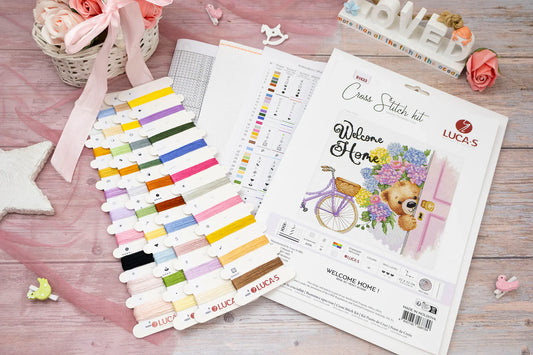 Luca-S B1433 – Welcome Home! | Kit de punto de cruz con osito, flores y bicicleta