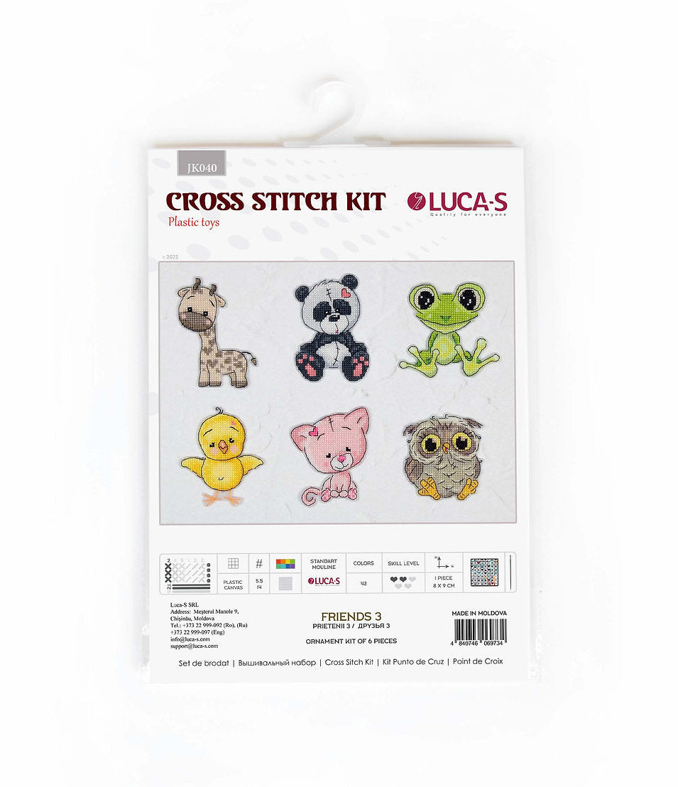 Crea 6 adorables animalitos de peluche con el Kit de Punto de Cruz Animalitos Amigos No.3 de Luca-S. Incluye una girafa, un osito panda, una rana, un pollo, un gatito y un buho en tela canvas plastico A4 de 21x28 cm. Con 42 colores de hilos de algodón "Luca-S" Mouliné, agujas No. 26, gráfico en blanco y negro e instrucciones en 10 idiomas. El nivel de dificultad es 2 de 5 y cuenta con calidad premium.