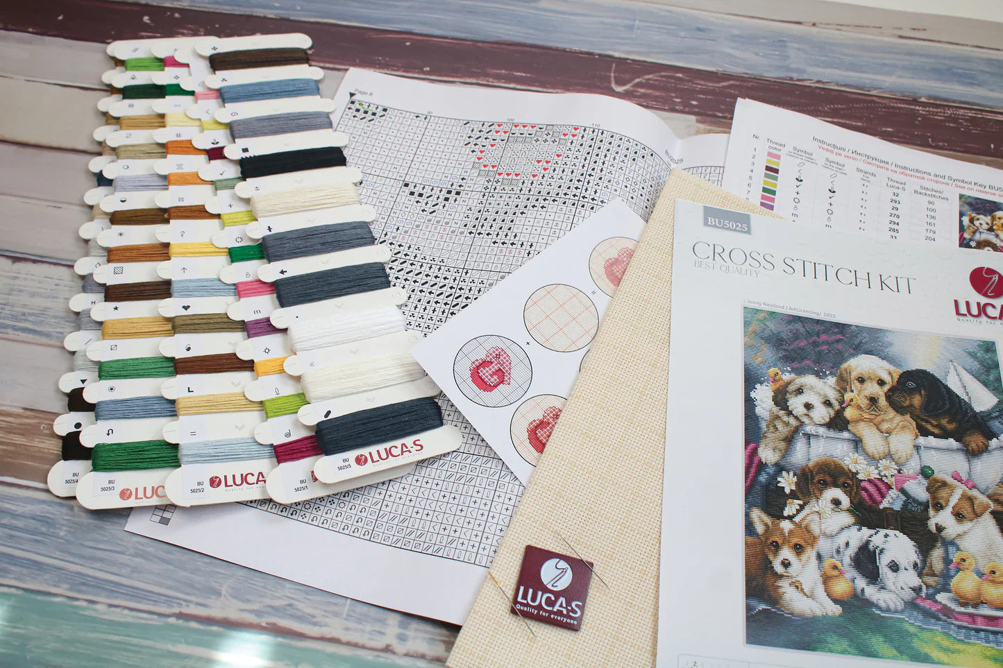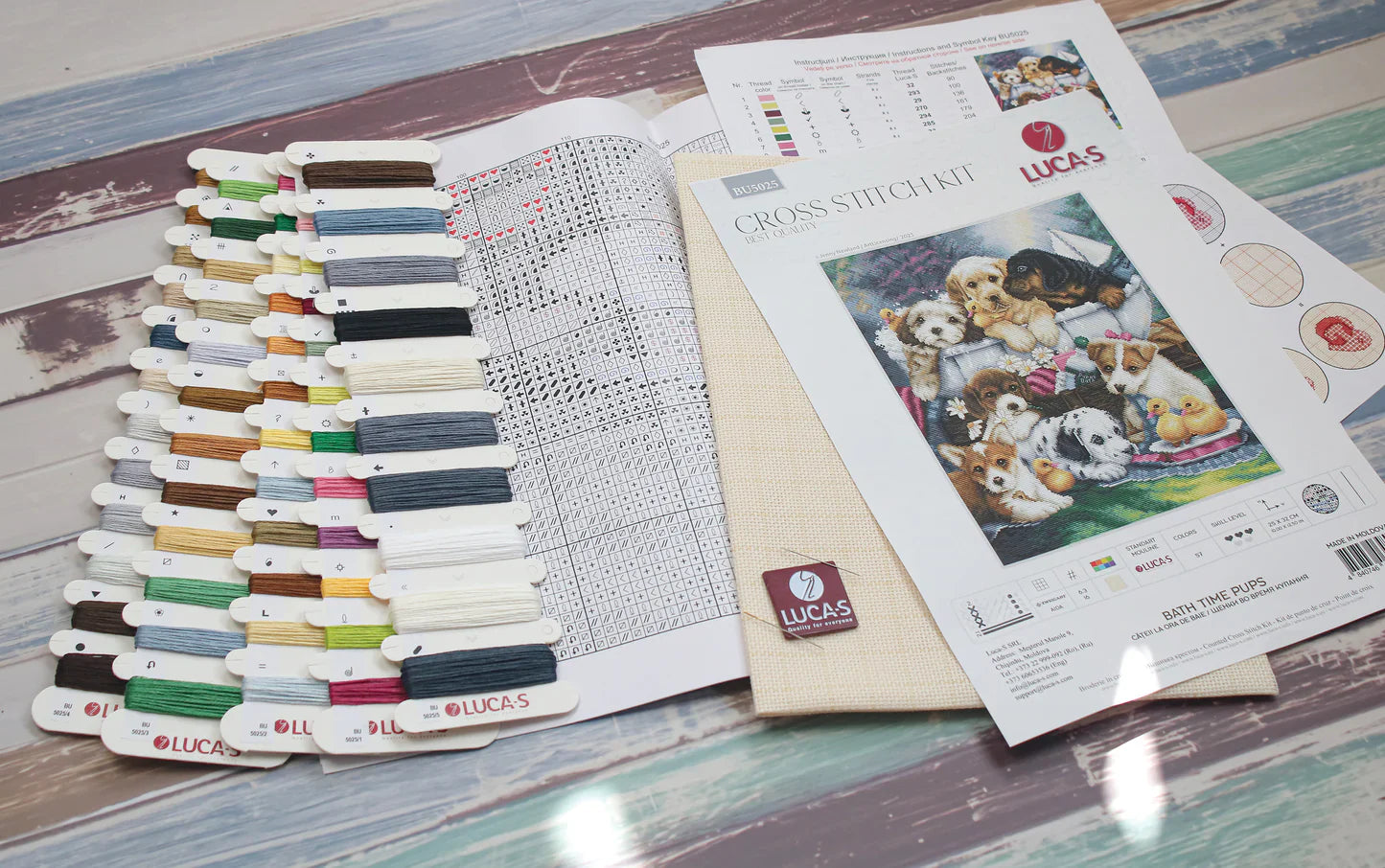 Luca-S Kit de Punto de Cruz - Bath Time Pups - ofrece una divertida experiencia de punto de cruz con una tela Zweigart Aida 16 ct. premarcada de 39 x 46 cm, 160 x 200 puntadas, 57 colores de hilos "Luca-S" mouliné de algodón 100%, aguja №26, gráfico parcialmente en color e instrucciones en 10 idiomas para satisfacer a los principiantes y los experimentados. El nivel de dificultad es 3 de 5. Inspirado en la obra de arte de Jenny Newland. ¡Disfruta de la calidad premium de Luca-S!