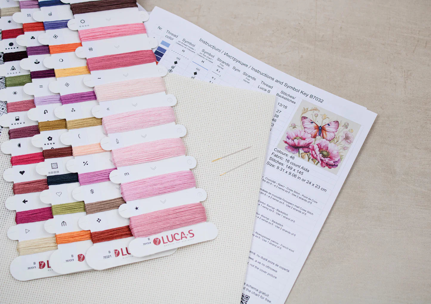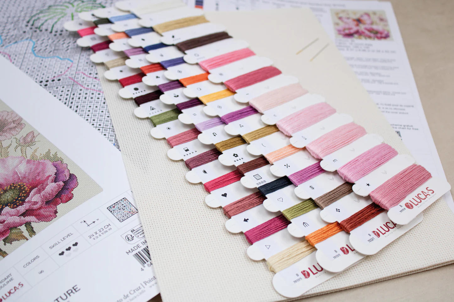 - Tela: Zweigart Aida de 16 ct. (264), de 38 x 38 cm, reconocida por su calidad y facilidad de uso.
