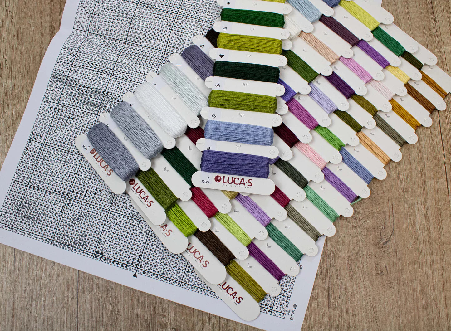 Este kit incluye tela Aida de 16 cuadros por pulgada en color blanco o blanco roto (100/101) con una medida de 54 x 46 cm, 66 colores de hilos "Luca-S" mouliné de algodón 100%, 2 agujas (una para punto de cruz y otra para punto lineal), un enhebrador simple, un gráfico en blanco y negro en 8 hojas de formato A3 y instrucciones en 8 idiomas.
