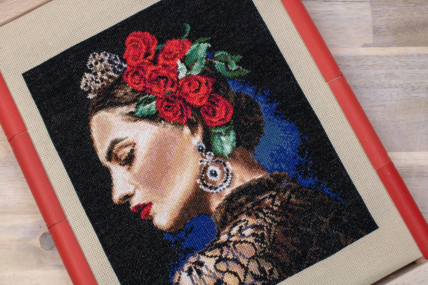 - Adéntrate en la creación de un retrato con una profundidad y belleza que solo el punto de cruz puede ofrecer, y una vez completado, tendrás una pieza de arte textil que captura la esencia atemporal de una musa.